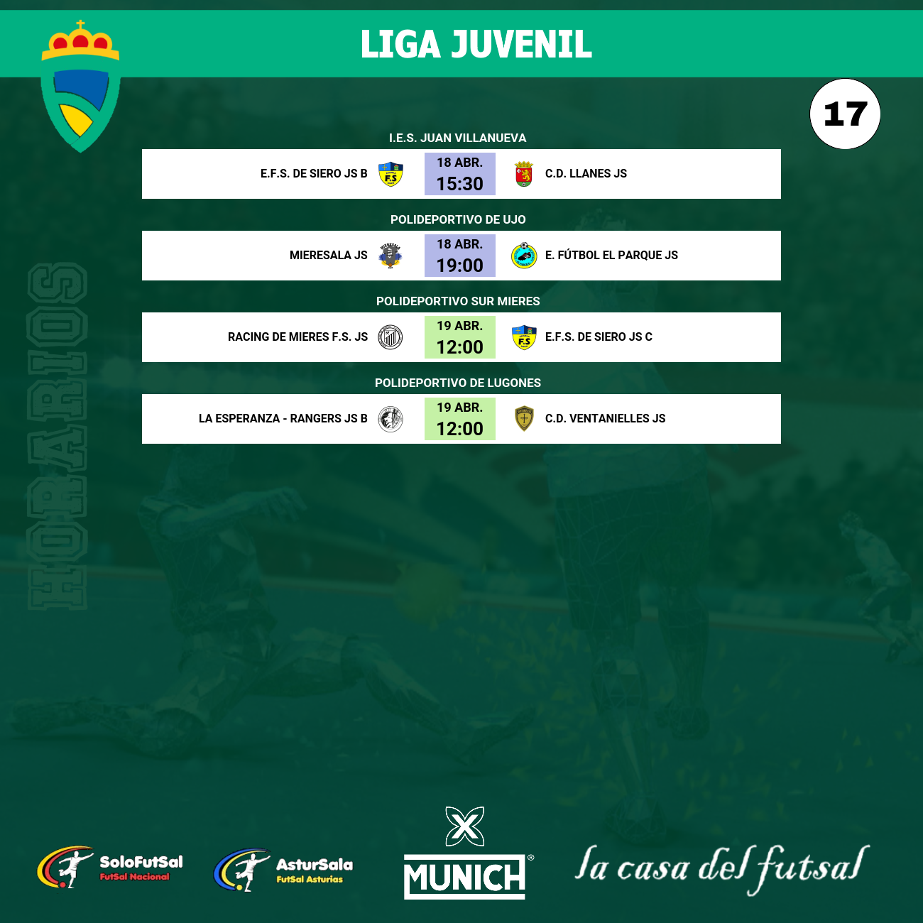 Por su parte, el E.F.S. de Siero B es el único equipo que depende exclusivamente de sí mismo para proclamarse campeón. Si los sierenses logran la victoria en los dos encuentros que les restan, alcanzarán los 42 puntos, una cifra matemáticamente inalcanzable para el actual líder. El primer y trascendental obstáculo en esta particular cuenta atrás lo tendrán este sábado a las 15:30 horas en el I.E.S. Juan Villanueva, donde recibirán a un siempre correoso C.D. Llanes. El conjunto del oriente asturiano, asentado en una meritoria cuarta posición con 22 puntos, no se juega grandes objetivos clasificatorios, pero ha demostrado a lo largo del curso ser un bloque muy bien trabajado que a buen seguro no regalará absolutamente nada al aspirante al título.