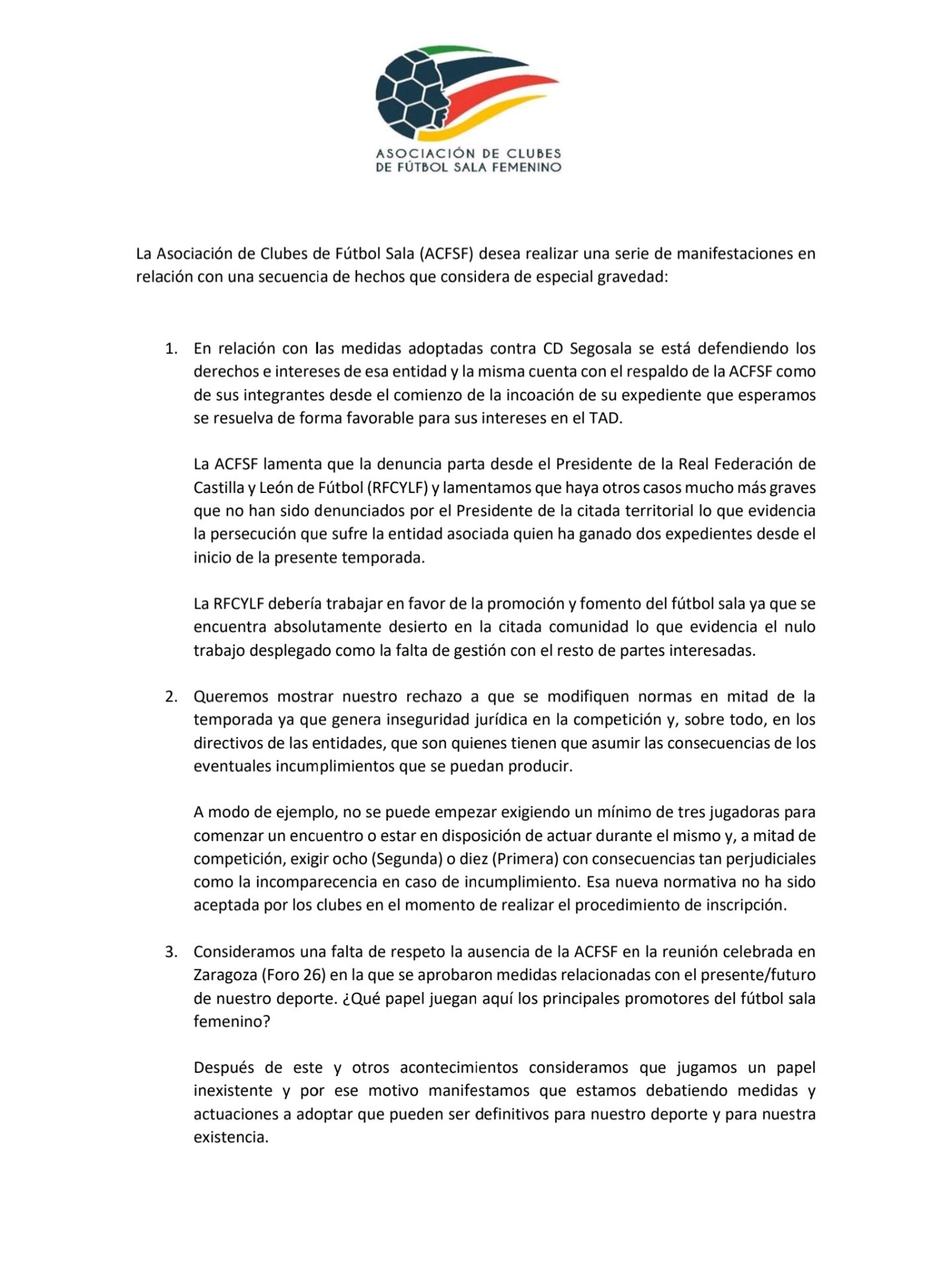 El comunicado señala directamente al presidente de la Real Federación de Castilla y León de Fútbol (RFCYLF) como promotor de la denuncia contra el club segoviano. La asociación califica la situación de "persecución", argumentando que la entidad ya ha ganado dos expedientes en lo que va de temporada y que existen casos más graves que no han sido denunciados por la territorial. Además, acusan a la RFCYLF de "nulo trabajo" y falta de gestión en la promoción del fútbol sala en dicha comunidad.